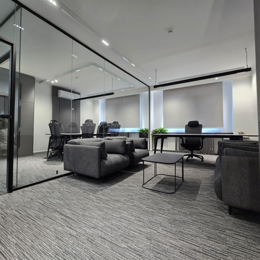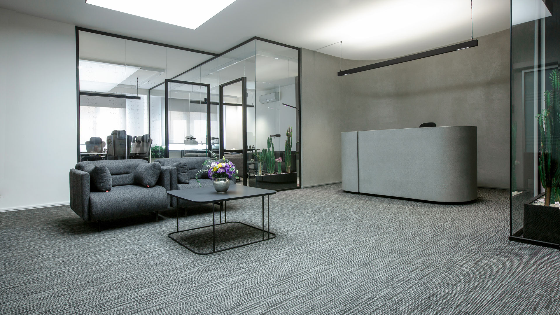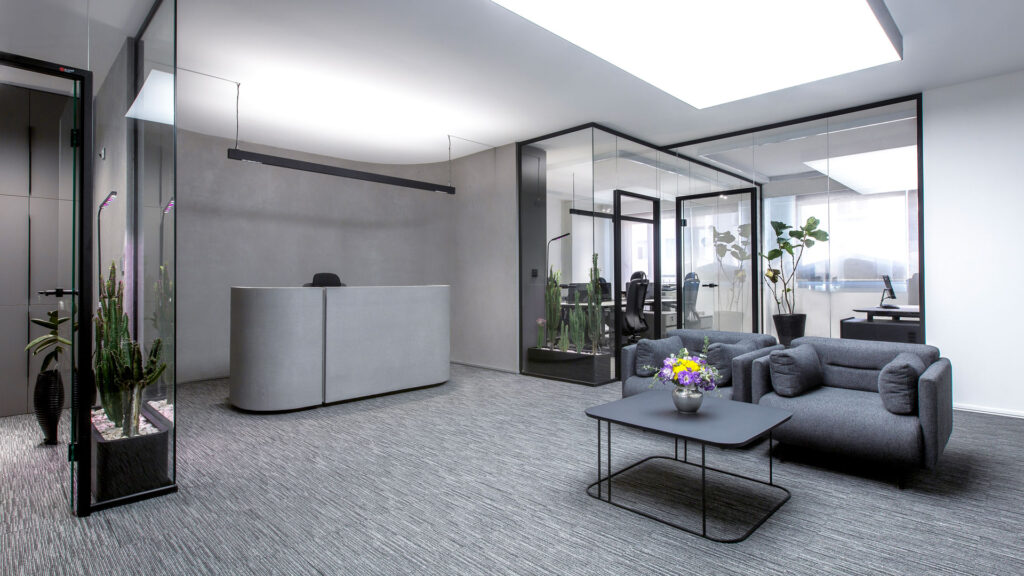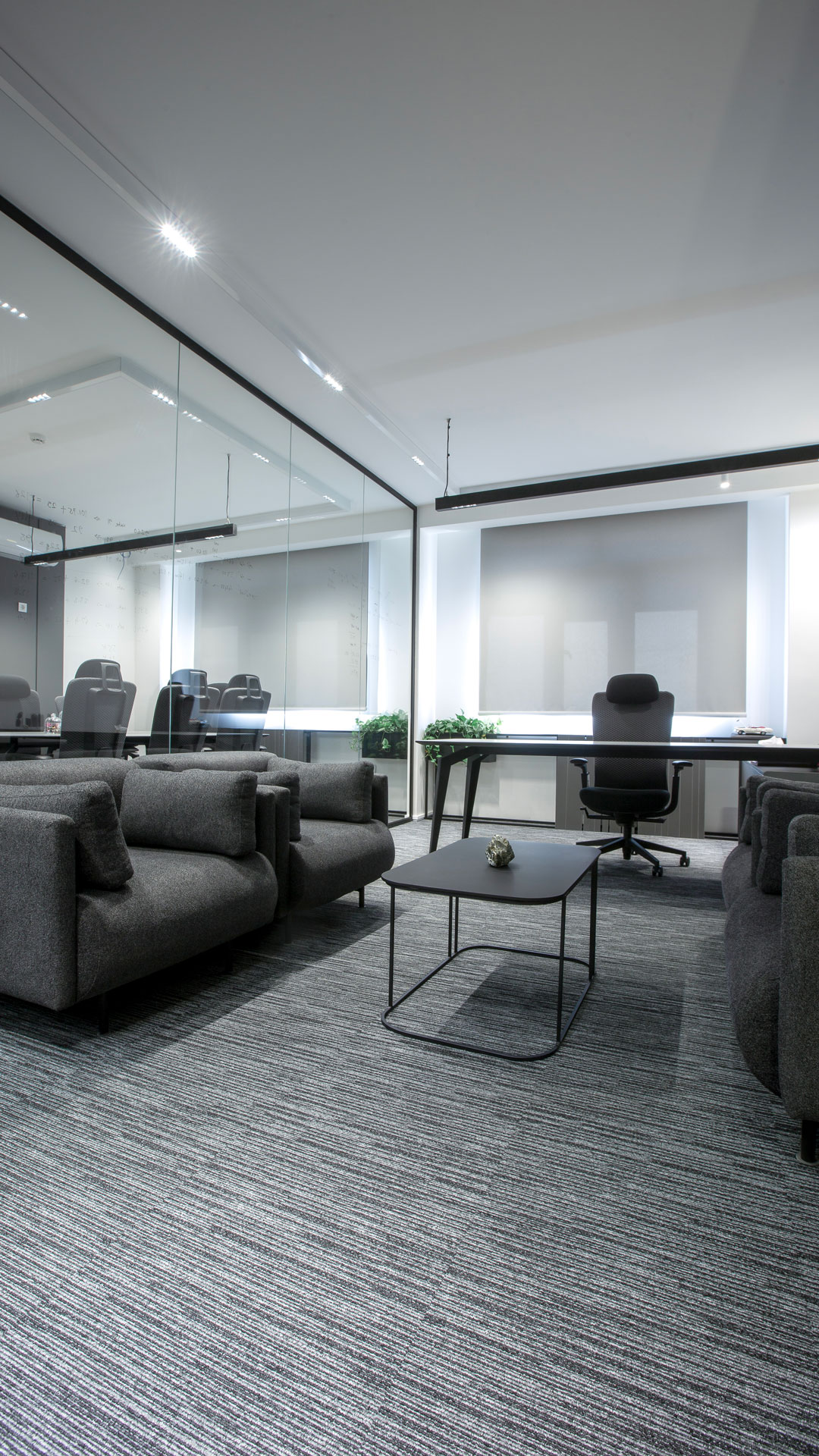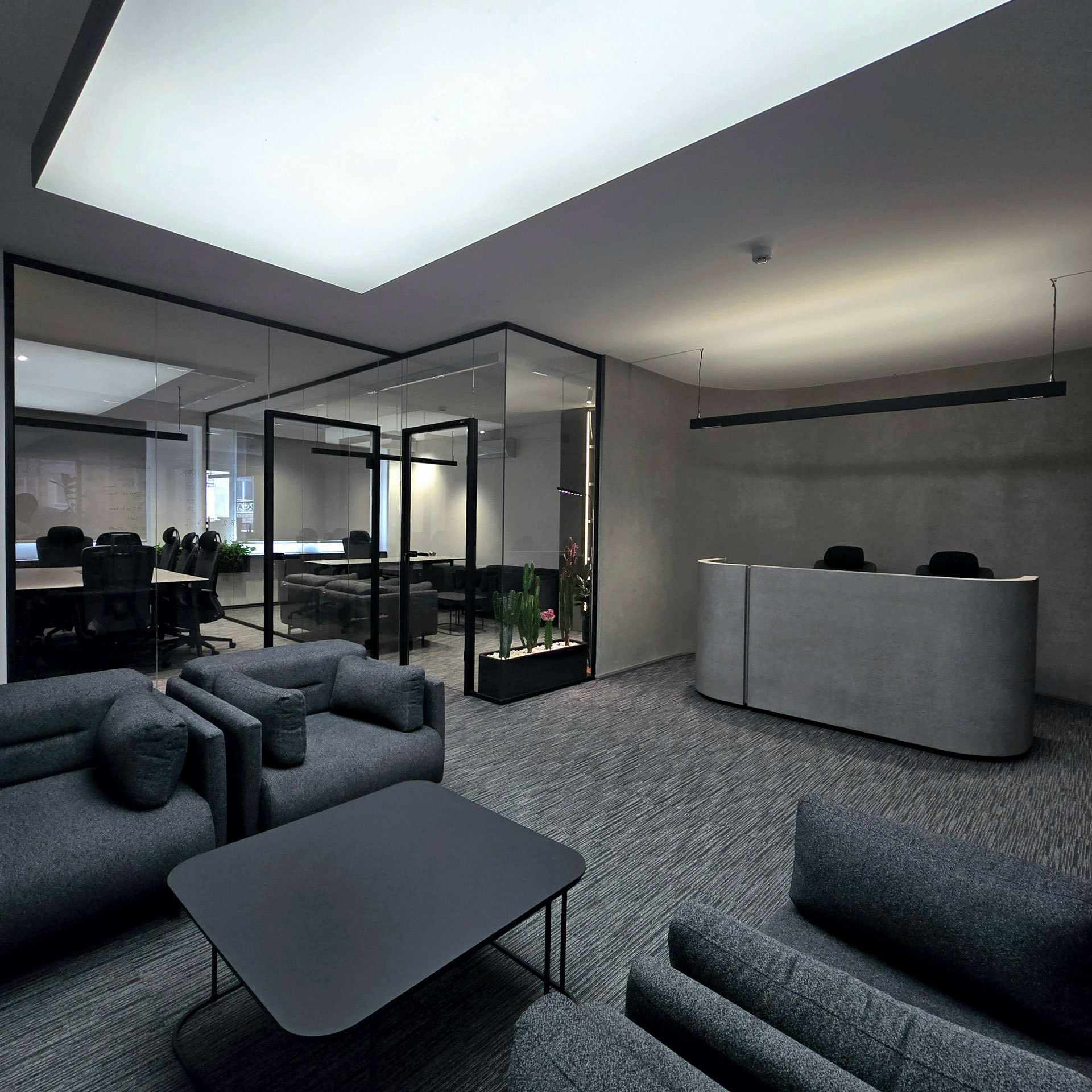 Upon arrival, visitors are greeted by a curved form that leads them into the space and directs circulation according to user needs. In the main lobby, microcement was applied as the primary surface material, creating a harmonious texture in combination with the selected furniture and carpet. A subtle yet deliberate color contrast is introduced exclusively through the presence of greenery. As per the client’s request, the lighting design, furniture arrangement, and color palette were all developed to enhance user focus and concentration within the workspace.