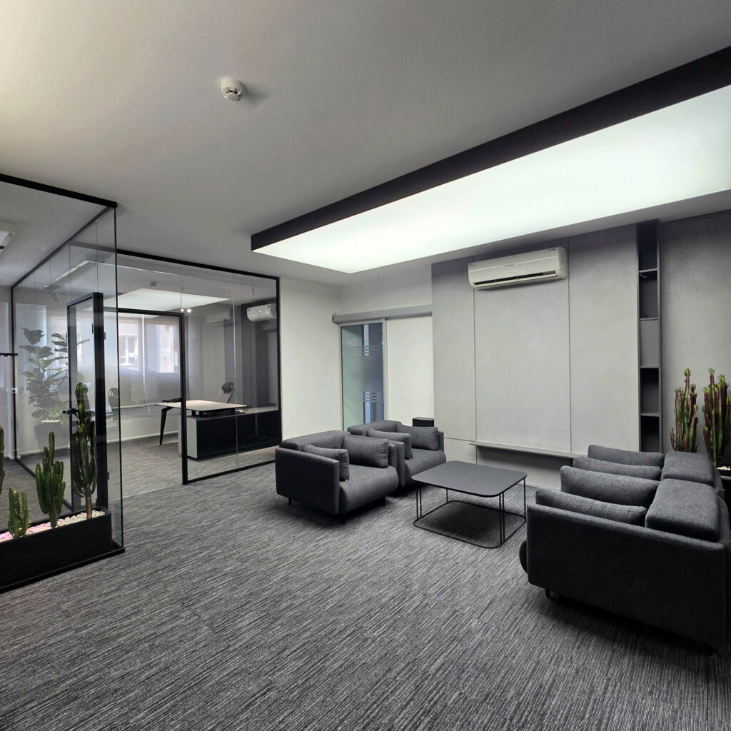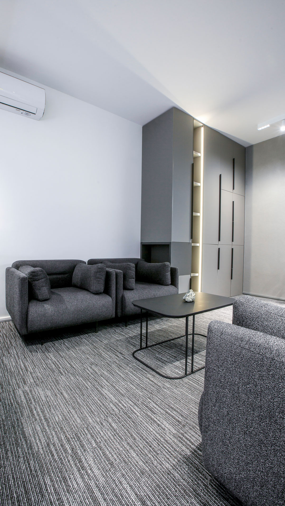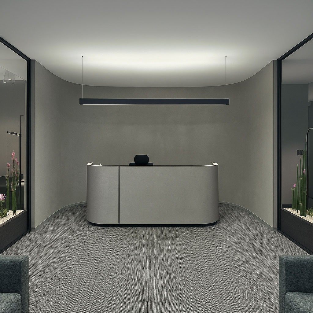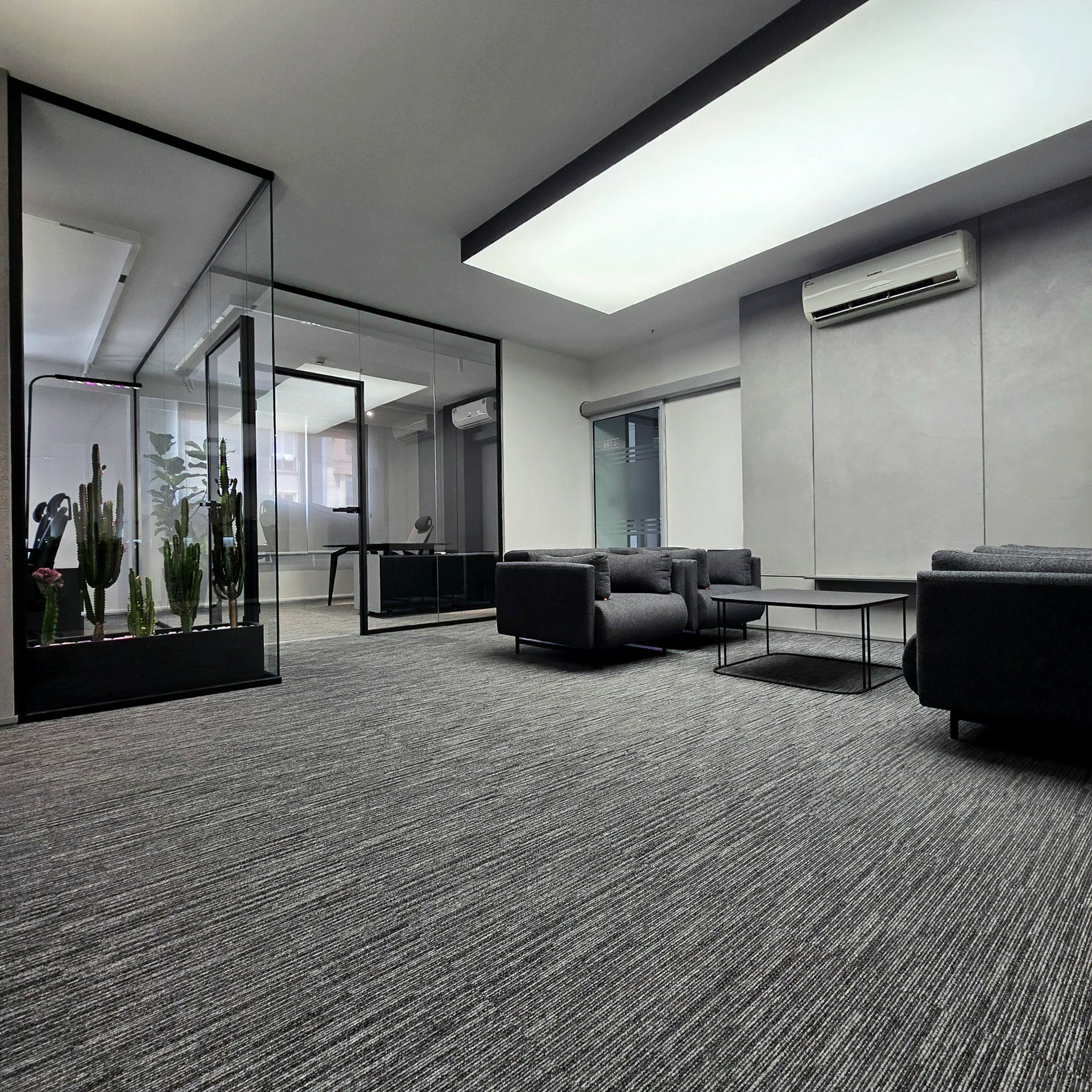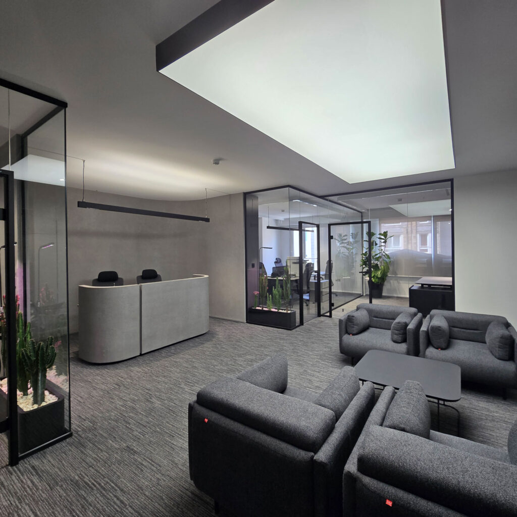 Upon arrival, visitors are greeted by a curved form that leads them into the space and directs circulation according to user needs. In the main lobby, microcement was applied as the primary surface material, creating a harmonious texture in combination with the selected furniture and carpet. A subtle yet deliberate color contrast is introduced exclusively through the presence of greenery. As per the client’s request, the lighting design, furniture arrangement, and color palette were all developed to enhance user focus and concentration within the workspace.