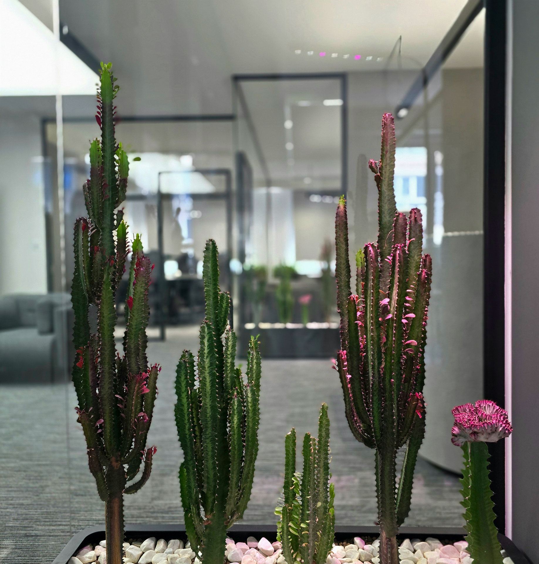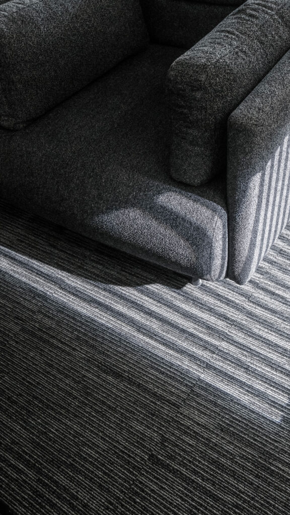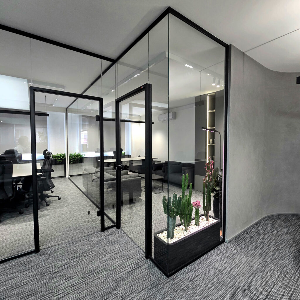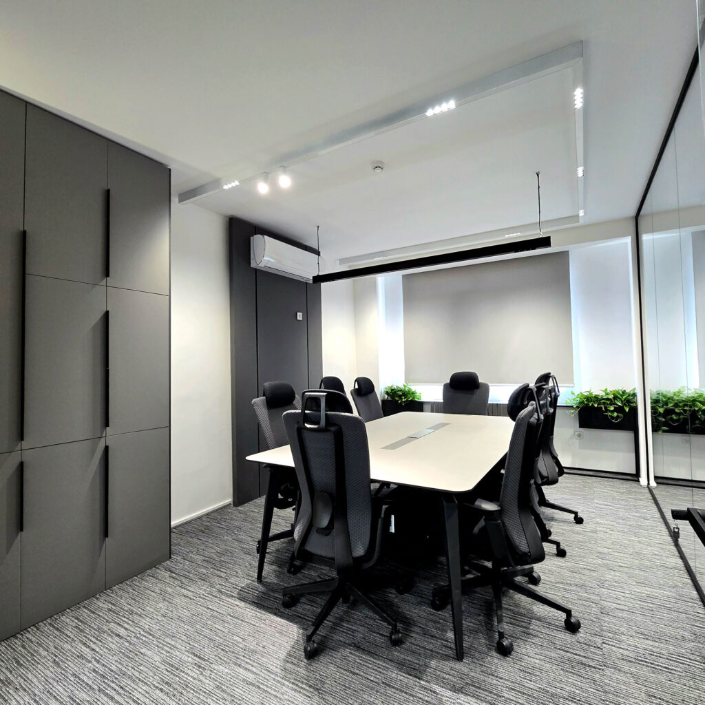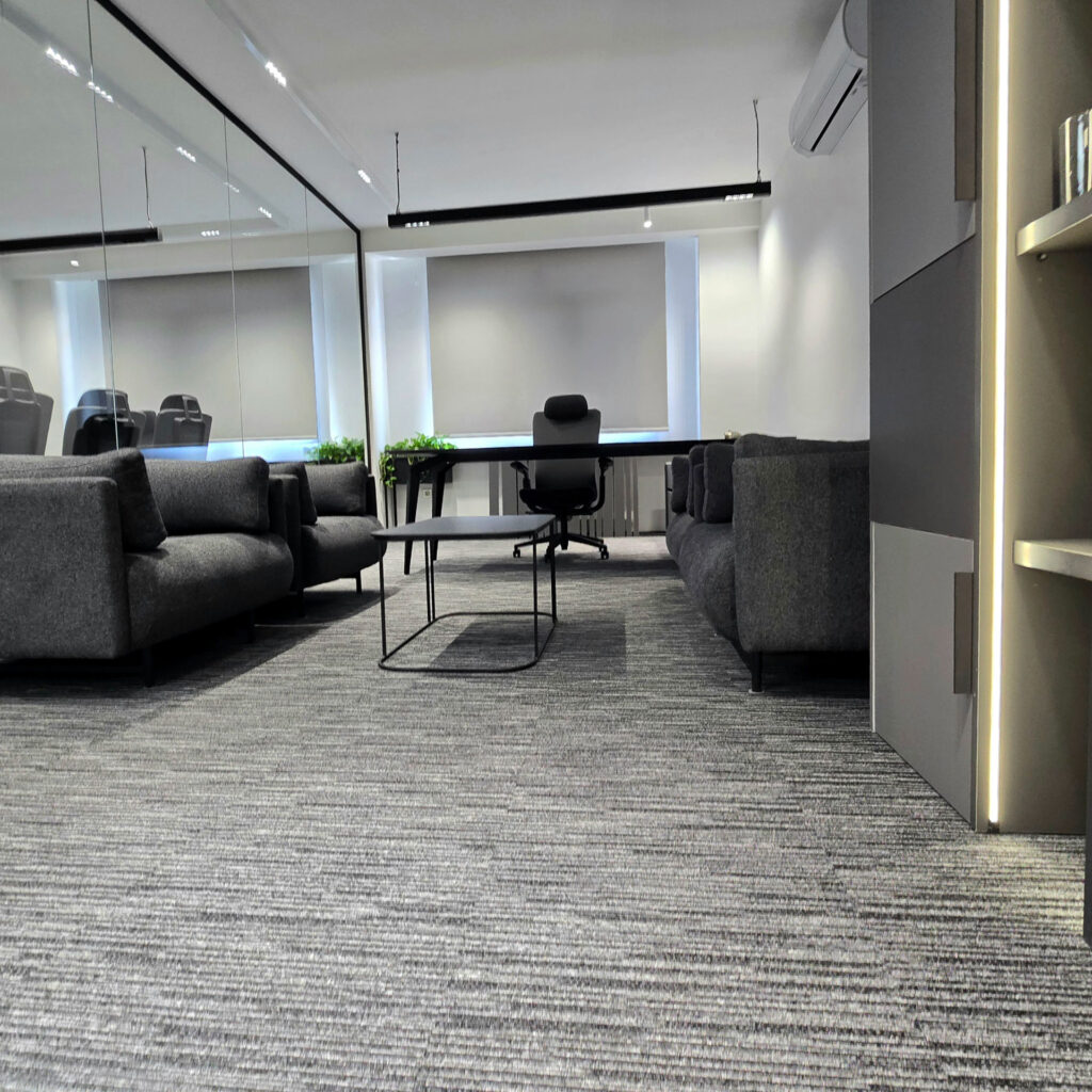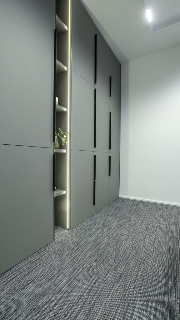 Upon arrival, visitors are greeted by a curved form that leads them into the space and directs circulation according to user needs. In the main lobby, microcement was applied as the primary surface material, creating a harmonious texture in combination with the selected furniture and carpet. A subtle yet deliberate color contrast is introduced exclusively through the presence of greenery. As per the client’s request, the lighting design, furniture arrangement, and color palette were all developed to enhance user focus and concentration within the workspace.